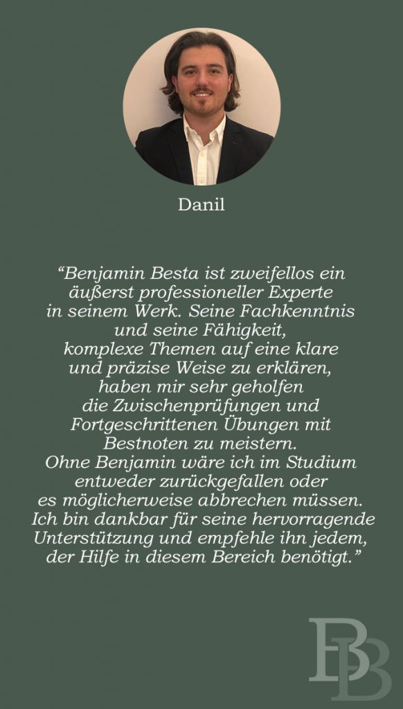 Mein Name ist Benjamin Besta. Ich arbeite seit mehreren Jahren hauptberuflich als Jura Coach und verfüge über langjährige Nachhilfe-Erfahrung und betreue erfolgreich in ganz Deutschland Studenten auf dem Weg zum Abschluss. Dabei gehe ich individuell auf deine Problemsituationen ein, um deinen individuellen Fahrplan zum erfolgreichen Abschneiden in den Klausuren und Hausarbeiten zusammenzustellen.